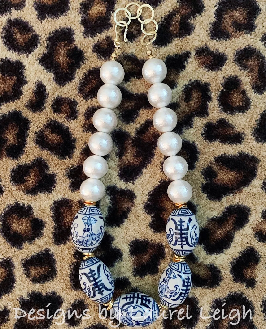 This stunning hand beaded Blue & White Chinoiserie Pearl Statement Necklace is one of my handmade original designs. It is made with large white wooden beads, fabulous rare XL hand painted blue and white porcelain focal beads, jumbo Japanese cotton pearls and high quality tarnish resistant 24k gold plated accents and a brass toggle clasp. Necklace is 20-22" L.